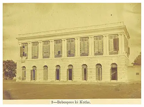 At a spot, a few miles eastward of the city, stand the ruins of the old palace of Bebeapore. Newab Ausuf-ood-dowlah, the first of the Newabs who made Lucknow the capital, built this palace as a country residence, and enclosed a park, in which an immensity of small game was preserved. Whenever a change of residents, or political agents, to the King's Court, took place, the new arrival always had this palace placed at his disposal, until he should be conducted in state to the Residency in the city. It was from here that went forth the memorable decree of the Government of India for the deposition of Wuzeer Ali, the adopted son and heir of Ausuf-ood-dowlah. Wuzeer Ali was subsequently removed to Benares, where he became notorious as the murderer of Mr. Cherry, the Governor-General's Agent. It was here also that Lord Teignmouth held a grand Durbar, the object of which was, to obtain the enthronement of Newab Saadut Ali Khan, in succession to Wuzeer Ali. The object was attained, and the reign of Saadut Ali Khan proved eminently successful.
