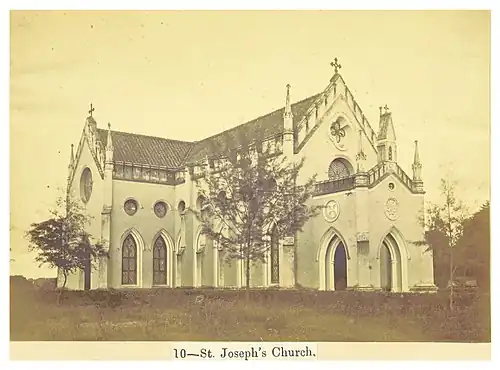 This beautiful chapel was brought into existence by subscription from the Roman Catholic community of the Civil Lines; its neat appearance and cleanliness speak well for the energy of the Chaplain, Father Lewis. Further on towards Huzrutgunge, are the coach manufactory of Messrs. Hormusjee and Company, Messrs. Conway and Company, and Messrs. Sinclair and Company; going on to the eastward, past the well-stocked bazar of Huzrutgunge, through the handsome shady trees will be seen the graceful spire ofโ