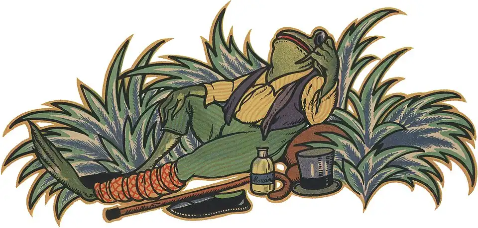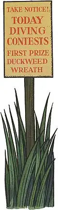 “Ah, my boy,“ said he sadly to the young Mouse, “once I was a stalwart hero like yourself. These swollen feet of mine were as full of action as steel springs. Whenever a fly chanced to flash by above my home, I leapt after it like a flying bird, so high I almost touched the clouds! And in every contest held here, I always dove the deepest of all into the water and won the wreath of duckweed.