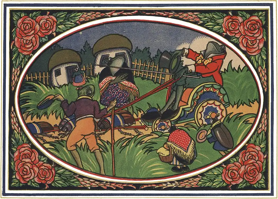 The first son of the Mouse family wandered to the edge of a marsh. Not far off a sick Frog was trying to warm his limbs in the spring sun. The poor Frog had only a bed of mud to lie on, and his bed-covers were made of slippery foam.