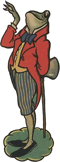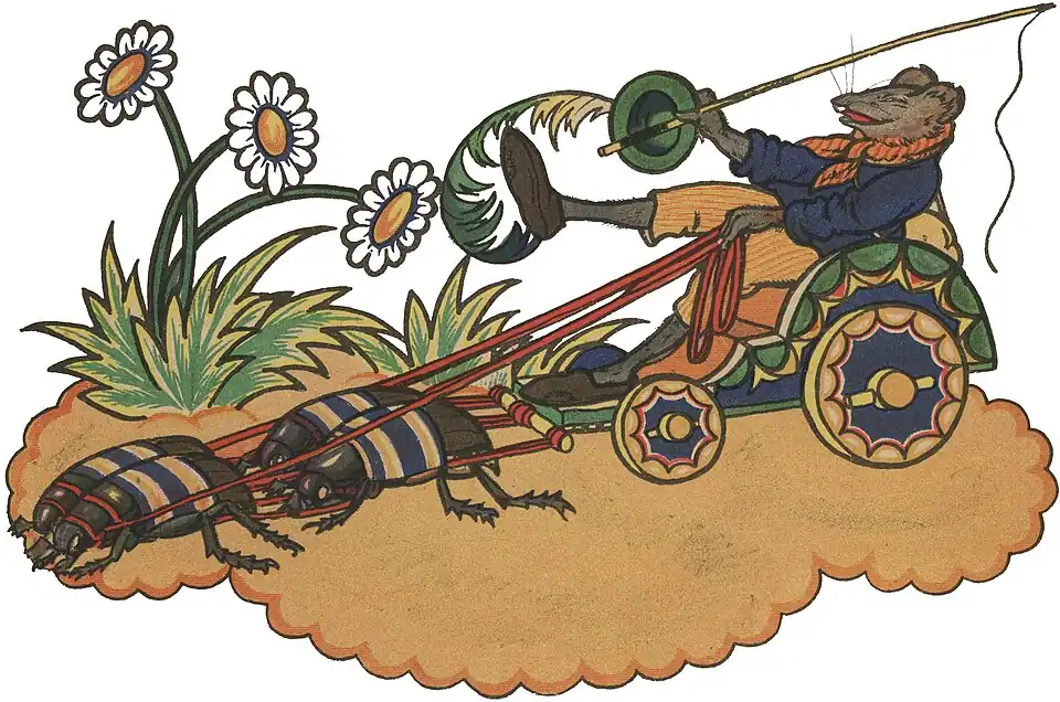 As the Frog thus exulted, a new wonder of wonders came to pass. A carriage appeared shining like gold and drawn by strong young beetles. Master Frog gaped in amazement. He could scarcely believe his eyes. Then, almost before he knew what he was doing, he was sitting down on the soft velvet of the seat and waving the magic wand for an excursion trip.