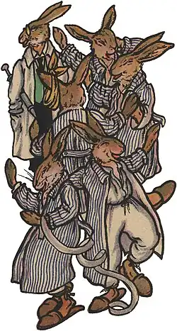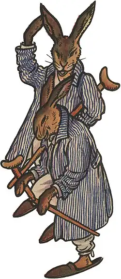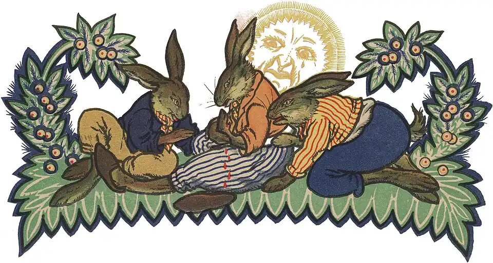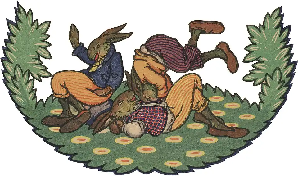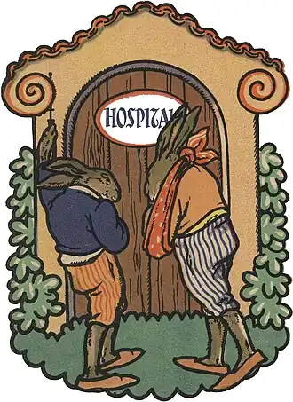 When my little paw saw its loss, it was in despair. It wept crimson tears for the vanished thumb. “Don’t cry, little one,“ said I. “We Rabbits have a hospital in the forest yonder. There you will get a bandage, and perhaps—who knows?—even a new thumb.“