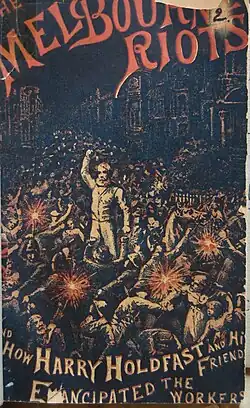 Taking in the state of affairs, and noticing the perplexity of the labor leaders, Slymer instantly brought himself “in evidence” before the crowd. Hastily rising to his legs, he once more addressed the masses of people who thronged the streets, urging them to resist this “unwarranted breach of discipline on the part of the officials” as he called it, and inciting them to deeds of violence to redress this wrong; he called, in the name of justice, upon those who had been “spoliated” by the capitalists to take their revenge and “loot the shops of the Collins Street aristocracy.” Instantly a rush was made down the street, shutters were torn down, windows smashed with the broken shutters, and the jewellers' and other shops were burst open. A cry was raised “To the banks!” and large numbers rushed for these time-honored representatives of vested interests, but they were too firmly constructed to be burst open, and the crowds returned to the shops of the “small-fry” capitalists. The police and the troopers were powerless to stop the furious onslaught of the people, although they mercilessly beat them with their batons and their swords until wounded and dying rioters were lying about in all directions.