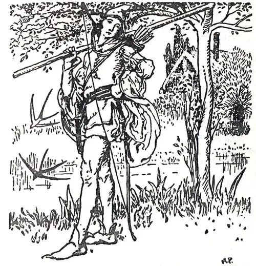 It was well for Robin Hood that that same forester's head was spinning with ale, or else he would never have taken another step. As it was, the arrow whistled within three inches of his head. Then he turned around and quickly drew his own bow, and sent an arrow back in return.