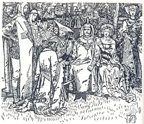 But now all the benches were filled with guests, lord and lady, burgher and dame, when at last the Sheriff himself came with his lady, he riding with stately mien upon his milk-white horse and she upon her brown filly. Upon his head he wore a purple velvet cap, and purple velvet was his robe, all trimmed about with rich ermine; his jerkin and hose were of sea-green silk, and his shoes of black velvet, the pointed toes fastened to his garters with golden chains. A golden chain hung about his neck, and at his collar was a great carbuncle set in red gold. His lady was dressed in blue velvet, all trimmed with swan's down. So they made a gallant sight as they rode along side by side, and all the people shouted from where they crowded across the space from the gentlefolk; so the Sheriff and his lady came to their place, where men-at-arms, with hauberk and spear, stood about, waiting for them.