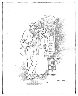 A prowlin' moll sneaks by, wiv eyes all 'ate,
