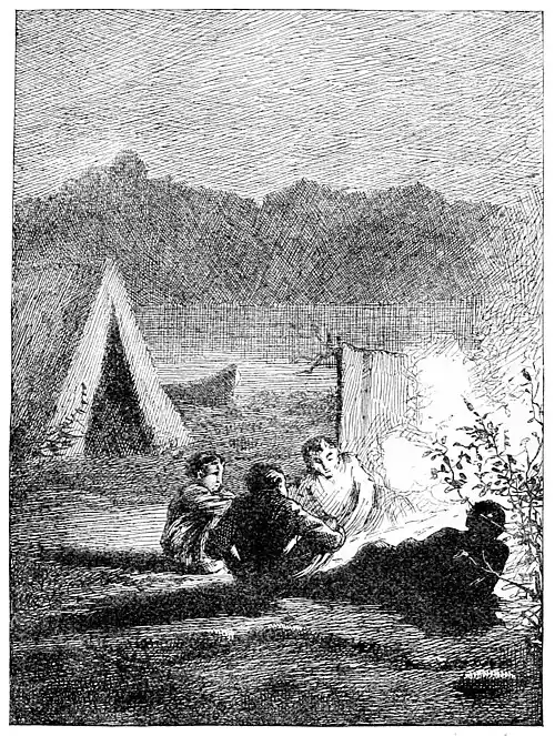 There happened to be a dead tree near by, and it was soon converted into firewood. The boys built a roaring fire on a large flat rock, and after it had burnt for a little while they pushed it about six feet from the place where they had started it, and, after piling fresh fuel on it, laid down on the hot rock with their feet to the flames. The fire had heated the rock so that they could hardly bear to touch it, but the heat dried their wet clothes rapidly, and kept them from taking severe colds. Meanwhile their blankets had been spread out near the fire, and in half an hour were very nearly dry, and pretty severely scorched. Two large logs were then rolled on the fire, and when they were in a blaze the