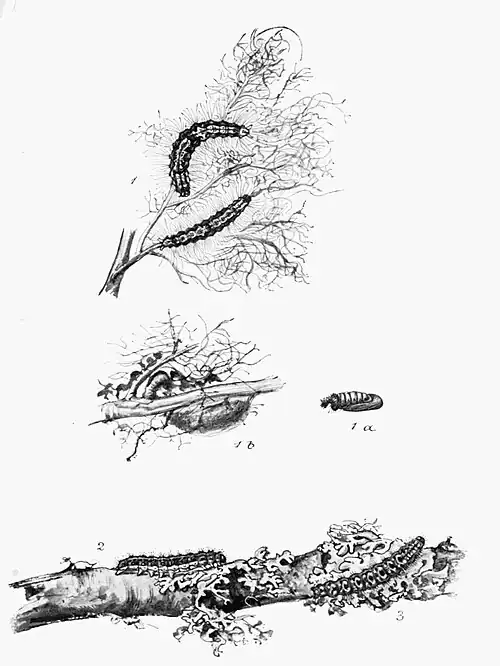 The caterpillar is greyish, more or less freckled with ochreous; three lines along the back, the central one whitish, the others black and interrupted; the hairs arising from reddish warts are brown or greyish brown. Head black. It feeds from July to October on lichens, chiefly those growing on fir and oak, but also on beech, and on old palings. Chrysalis, glossy dark red-brown in a tight-fitting cocoon of silk mixed with the hairs of the caterpillar; spun up among the lichen. The moth is shown on Plate 92, Figs. 5, 6, and the caterpillar and chrysalis on Plate 93.