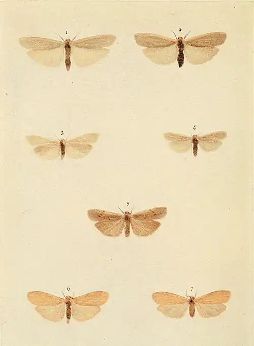 This moth is orange yellow on the fore wings, and a paler shade of the same colour on the hind wings. Except that the tint is brighter in some specimens and darker in others, there is nothing to mention in the way of aberration. (Plate 99, Figs. 6, 7.)