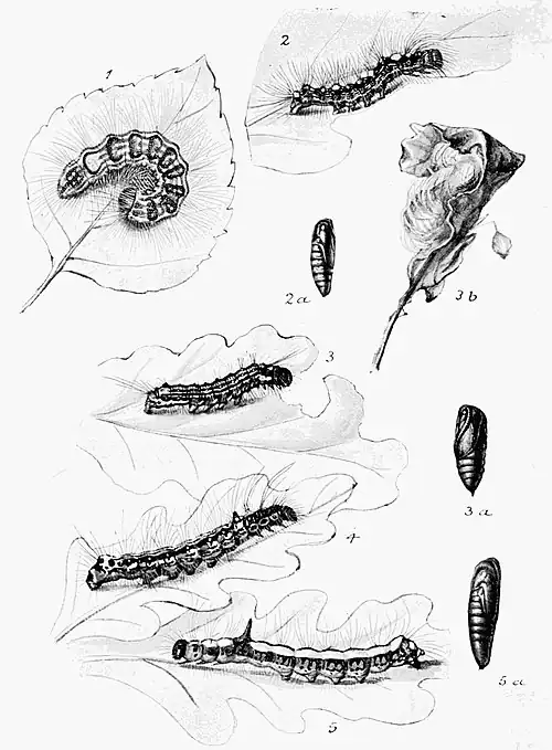 The caterpillar is figured on Plate 102, Fig. 2. It is slaty grey in colour with a black plate on the first ring; on the back of each ring is a broad black band, and four orange warts from which arise golden-yellow silky hairs; the hairs on the sides are pale drab (adapted from Buckler). It feeds in June and early July, sometimes in September, on oak, birch, various kinds of Rubus, such as blackberry and raspberry, and also on bilberry (Vaccinium). The moth is out in late April and in May; occasionally late July and in August. It is rarely seen in the day time, but has been found resting on tree trunks. The range abroad extends to Southern Russia and Siberia.