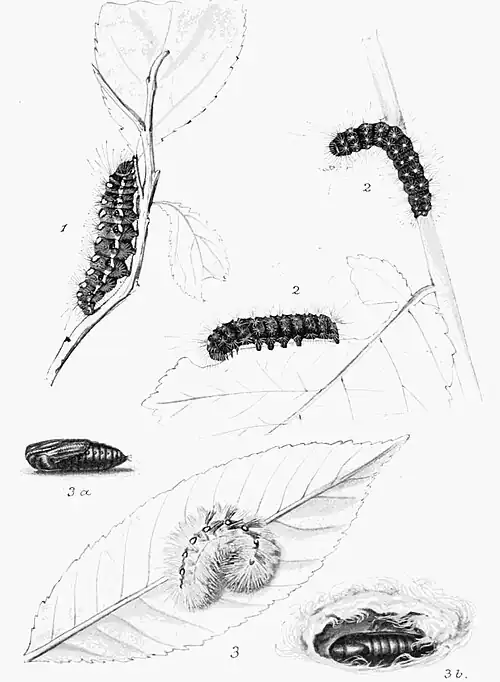 The caterpillar is ochreous or grey brown, marked with blackish; a conspicuous character is a black-edged whitish or ochreous patch on ring ten; the hairs are whitish, those on the sides rather long. It feeds from July to September on the foliage of poplars. (Plate 101, Fig. 1).
