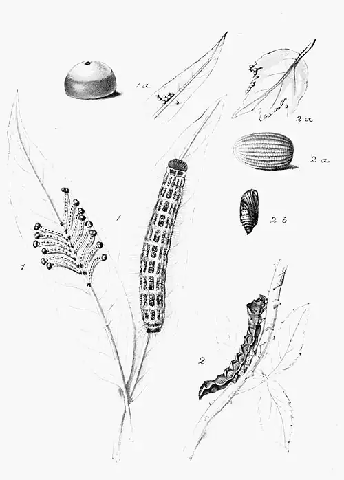 The fluted greenish-white eggs are laid upon the edges of bramble-leaves.