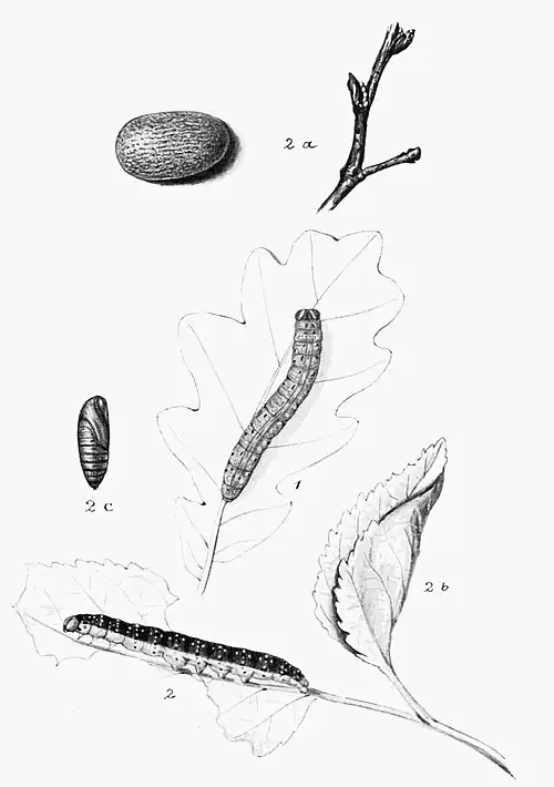 The caterpillar (Plate 38, Fig. 1) is yellow above and rather greenish beneath; a greenish grey double stripe along the back is interrupted at the ring divisions; there are also white dots with black or blackish edges on the back and the sides; a yellow line along the spiracle area is shaded above and below with greenish grey; the head, which is notched on the crown, is yellowish, with a black mark on each cheek. It feeds, at night, on oak, from May to July; hiding by day on the underside of a leaf, a portion of which is folded over and secured with silk, to form a suitable retreat. These caterpillars respond more readily to the persuasive beating-stick than others of the group.