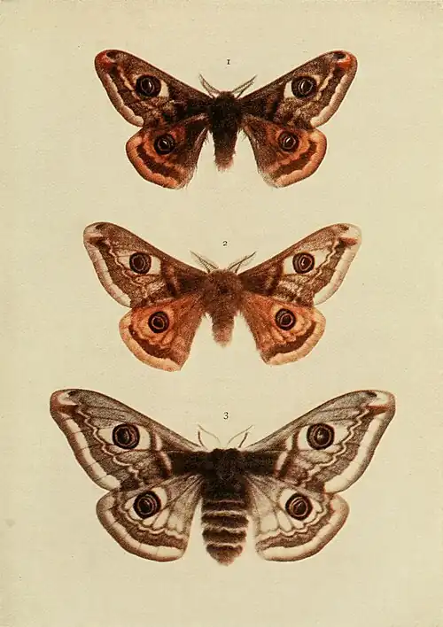 In a general way the fore wings of the male may be described as purplish grey, suffused with rosy or with tawny shades; a reddish cloud, black marked above, at the tips of the wings; the outer margins are more or less whitish, and there is a whitish patch about the middle of each wing, in which is an eyed spot; the hind wings are tawny, with a central eye spot and a blackish band towards the outer margin. The female has all the wings pale purplish grey, with whitish bordered outer margins; markings much as in the male, but the central area of the hindwings is more or less whitish. There is some variation in the ornamentation; occasionally the white markings are of large size, or, on the other hand, may be almost or quite obscured. Very rarely the eye-spots are absent from all the wings (ab. obsoleta, Tutt), and sometimes they are of abnormal shape. Now and then specimens of the female sex are dark in colour, with red bands, and Barrett mentions an example of this sex smoky black in colour, with still blacker markings (Plate 66).
