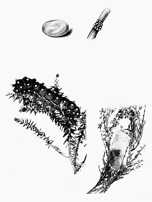 The olive brown, clouded greyish eggs are laid in neatly arranged batches around the stems or twigs of plants; I once found a batch in North Devon on a loose piece of rock. The caterpillar when full grown is bright green, with black markings; the warts from which blackish bristles arise are yellow, sometimes pink or blackish. In an early stage it is black, with an orange line low down along the sides; later on it is still black, but ringed with orange. It feeds in June, July, and August on many kinds of plants, among which may be mentioned heather, bramble, sallow, sloe; also meadow-sweet (Spiræa ulmaria) and purple loose-strife (Lythrum salicaria).