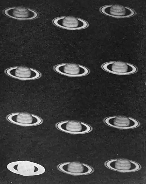 Every 15 years the plane of the ring passes through the plane of the earth and hence it is seen edgewise to the earth. It then almost disappears, being so thin as to be seen only in the larger telescopes._-_figure_154.jpg)