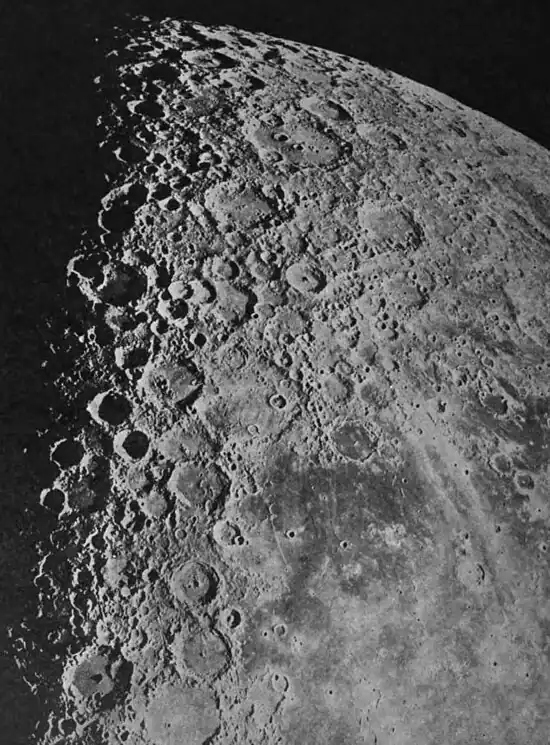Photograph by Mount Wilson Observatory through the 100-inch Hooker telescope. Chacornac mentions a walled-plain called Schickard, on the southeast portion of the moon, which is 134 miles in breadth, and, although encircled by a mountain wall which in one place is nearly 10,000 feet high, a spectator centrally located on the floor of the crater would think himself on a boundless desert, for this encircling wall, due to the curvature of the surface of the moon, would lie entirely beneath his horizon.
