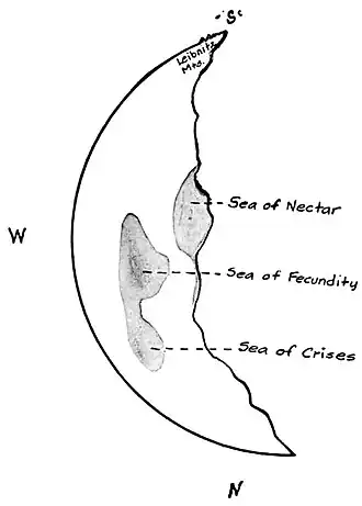 The most prominent object in the narrow crescent is the Mare Crisium or the Sea of Crises, 380 miles long. South of Mare Crisium is Mare Fecunditatis, the Sea of Fecundity and Mare Nectaris, the Sea of Nectar. When these three "Seas" are visible with Mare Tranquillitatis just coming into view, the moon is between 5 and 6 days old, that is, 5 or 6 days after new moon. The Leibnitz mountains may then be seen near the southern pole. Watch carefully evening after evening as the light creeps over new regions and brings them into view. The best place to select for observation is the boundary line between the illuminated and unilluminated portions, called the "terminator," for the shadows that are cast make the irregular features stand out more distinctly and bring out the individual beauties of the lunar scenes. Since we are looking down upon the moon, a mountain peak, at this distance, resembles a point of light, and a mountain range whose base is still in the shadow, but whose peaks are lighted by the rays of the sun, a straight or curved row of lights. Besides beautifying the country of the moon and revealing to us the peculiar sharpness of the mountain peaks, the shadows have proved of great practical value to astronomers, for by measuring the length of their shadows, the heights of the mountains are calculated.