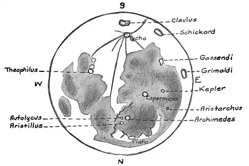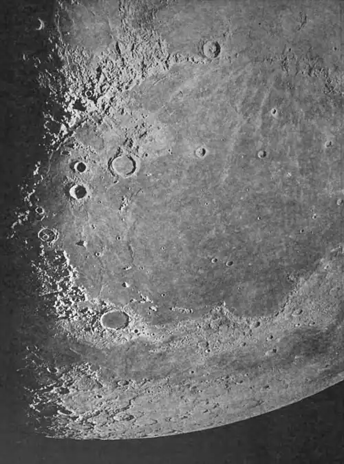 Again starting from Copernicus and letting the eye travel northwest along the Apennine mountains almost to the Caucasus, one arrives at a group of three beautiful craters which rest conspicuously on the level floor of Mare Imbrium. The largest of these craters is named Archimedes after the most celebrated of ancient mathematicians. It is to be noted that lunar craters have been given the names of great men—Copernicus, Tycho, Kepler, great astronomers; Aristotle, Plato, great philosophers,—a very fine recognition of scholarly worth. Archimedes, 52 miles in diameter, has no interior mountain, but the shadows of its tall rim are imposing as they fall across its plain._-_figure_166.jpg)