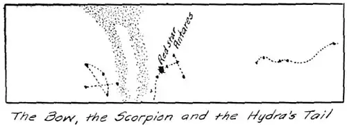 This centaur, now called Sagittarius, the Archer, was given a constellation near the southern horizon, indeed, he lies so far to the south that he is partially hidden from view and only the head and bow and arrow may be seen by most of us living in the United States. His constellation may be easily located by first finding the Scorpion, which has a large, well-defined anchor-shaped figure marked in the center by a brilliantly red first magnitude star.