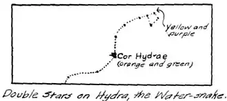 The only noticeably bright marking on the Water-snake is the orange-hued star of the second magnitude which lies upon the reptile's heart. This star is called Cor Hydræ after its location, but it also has the name of Alphard, the Solitary. Since the naming of the star, science has discovered the latter name to be rather a misnomer for it has a telescopic companion of a pale shade of green. Cor Hydræ rises in the early evening on the 21st of February, and passes the meridian about 9 o'clock during the middle of March.