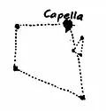 It is further related that one day while playing with the goat, Jupiter accidentally broke off one of its horns. In atonement, he filled the horn with fruits and flowers—the horn of plenty—and consoled the goat by giving it a constellation. The brilliant star, Capella, lies on the heart of this goat, the name signifying "the little She-goat," and not only the Greeks and Romans, but the ancient Peruvians, far across the ocean, connected this star with the affairs of shepherds. English poets refer to Capella as the "Shepherd's Star."