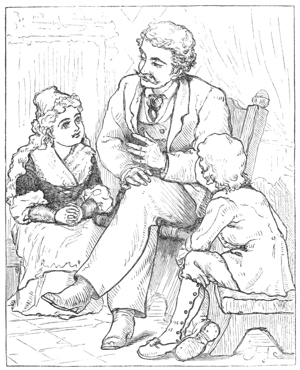 Late into the night did they all sit over the fire, while Fritz told the story of his seven long years of absence. It seemed to the children very exciting; for Fritz had twice been shipwrecked, had seen a buffalo, and only just escaped being killed by an Indian! He had been very poor too, and suffered such hardships that he could not bear to write home the tidings of his ill-luck. But now things were better. Out on the Western frontier of the United States (here Max and Thekla smiled at each other and thought of "Chusey") he had found employment and kind friends, and managed to save from his wages enough to buy a little farm. He told of the oaks, the noble rivers, the plentiful food and rich soil, the splendid colors of the autumn forest.