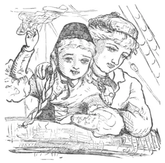 One week later a large ship weighed anchor in a port, and upon her deck stood our two children and their new brother. There was no one to see them go. All their few farewells had been spoken in the distant village and beside Grandfather's grave. But as the heavy cables swung and heaved, and the vessel, released from bondage, moved slowly from the harbor, upon the slope of a snow-covered hill beneath which she passed, amid the nodding pines which crowned the top, a group of figures suddenly appeared. They were the twelve Months come to wave farewell to the children. There was January, disdainful as ever; sweet, rosy June; February, his honest nose reddened by the keen wind; May and April, clasping each other's waists like a pair of school-girls. When they saw Max and Thekla on the deck, a little chorus of laughter, exclamation, and "Good-bys" could be heard. Thekla caught the sound of March's wild "Ha! ha!" the rich voice of September; April's gleeful laugh, as she flung a handful of violets at the ship, and her sob when they fell, as of course they did, into the water, and were borne out to sea. A moment,—no more. The children had time for only one glad smile of recognition, before the vision vanished and was gone. And no one else on the deck observed any thing but the sun dancing on the snow, the dark evergreens, and a few tossing leaves of bright color which still clung to the bare boughs of an oak-tree.