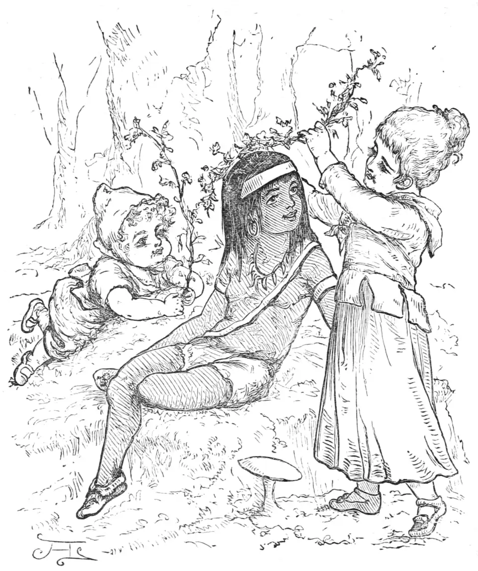 "Such games as they played! Baby pulled flowers till her lap was full. She tossed them about. She put heaps of them on her head, and screamed with laughter as they rained down into her eyes. Ruth meantime was turning the little Indian into a big nosegay. She stuck leaves all over him. His quiver she filled with blossoms. Round his head she put a wreath of long sprays. It was great fun. Luckily, the small russet petticoat had a pocket, and in it was a big ship'sbiscuit; so, when dinner-time came, they ate that, and were not hungry. As long as the sun shone, the play lasted; and he stayed late that night, as if to enjoy the pretty show as long as possible. But at last the long shadows had begun to creep over the place, and I to feel embarrassed as to how to get my babies home again, when the bark of a dog was heard close at hand. Then I was easy; for I knew somebody was coming to find them.