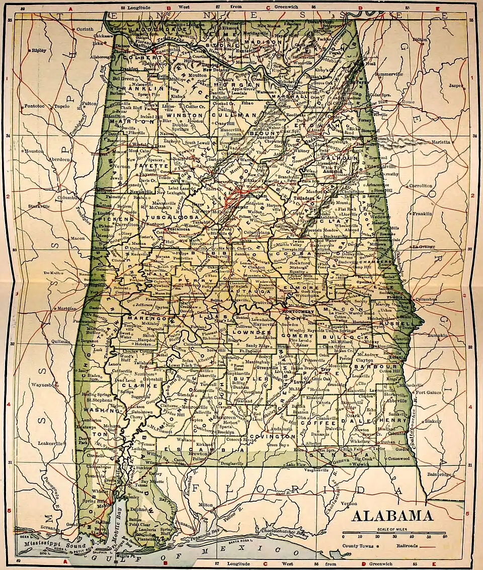 ALABAMA, ăl′ȧ-bä′mȧ, known as the “Cotton State.” One of the Gulf States of the American Union, situated between lat. 30° 10′ and 35° N., long. 84° 53′ and 88° 30′ W. It is bounded on the north by Tennessee, on the east by Georgia, on the south by Florida and the Gulf of Mexico, on the west by Mississippi; length, about 330 miles from north to south; average width, 175 miles; total area, 52,250 square miles, of which 710 square miles is water (Map: United States, J 4). Alabama, by the census of 1900, ranks as the eighteenth State in the Union in population, the twenty-seventh in size, and ninth in order of admission.