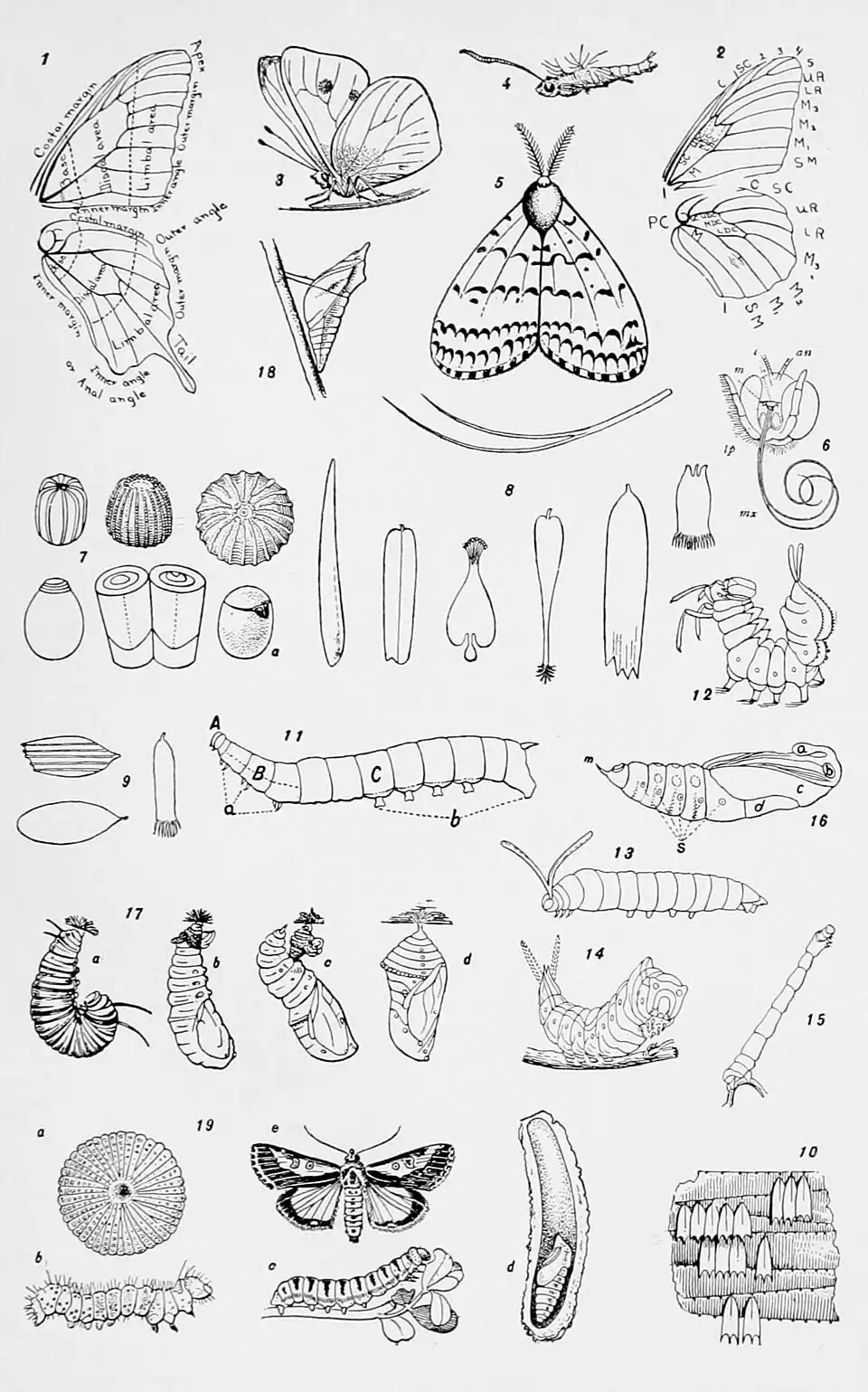 This larva, or ‘caterpillar,’ is a worm-like creature, and takes a form, color, etc., characteristic of its group and species. The term properly is restricted to lepidopterous larvæ alone, though sometimes applied to other larvæ, as those of the saw-flies. The head of the caterpillar is conspicuous, often large, and composed of horny (chitinous) material, taking various shapes. It is provided with six simple eyes (ocelli), usually to be seen only with the aid of a lens, which are either just above each mandible, or on each side of the head; there are two rudimentary antennæ. The mouth is adapted for tearing, cutting, and masticating the substances on which the caterpillar is destined to feed, which are very various in the different species, although in all extremely different from the food of the perfect insect; it is provided with strong upper and lower jaws; a labium, or lower lip; and four palpi. In the mouth (labium) also is situated the spinneret of those species which, when they change into the chrysalis, envelop themselves in silken cocoons. (See Silk.) The first three segments of the body are each furnished with a pair of short legs, which are hard, scaly, and clawed, and represent the six legs of the perfect insect; some of the remaining segments are also furnished with short feet (prolegs), varying in all from four to 10 in number, the last pair situated at the posterior extremity of the body; but these are membranous or fleshy, and armed at their extremity with minute hooks. Those caterpillars in which the prolegs (which are shed in the last molt) are pretty equally distributed along the body, move by a sort of regular crawling motion; but those which have only four such feet, near the posterior extremity, move by stretching the body out to its full length, taking hold by their fore feet, and then bending the body into an arch, thus bringing the hind feet forward, when the body is stretched out again for a new step, and so on; this last is the method of progression of the geometrid moths, called loopers, inch-worms, or measurers. The larva appears to guide itself by its feelers (palpi). The heads of many caterpillars also have defensive spines, or arrangements for emitting noisome liquids or odors, to be referred to later. The body of the caterpillar contains nearly all the organs of the adult butterfly or moth. Respiration goes on through nine spiracles on each side, two on each ring, except the second, third, and last. There are no external traces of sexual organs, but there arise, during this stage, the ‘imaginal disks,’ which develop into the wings and legs of the adult insect. These rudiments of wings exist even in very young caterpillars as a thickening and bagging in of the hypodermis. Into this bag, trachea and blood make their way. Just how these internal wings reach the outside is not known; probably by the destruction of the outside hypodermis. If the wing-membrane breaks during development, so that the blood or hæmolymph exudes, the injured wing will lie smaller or deformed. Sometimes the wings fail to expand properly because they dry too soon, and a wet sponge under a bell-jar, with transforming Lepidoptera, will aid in the production of perfect specimens.