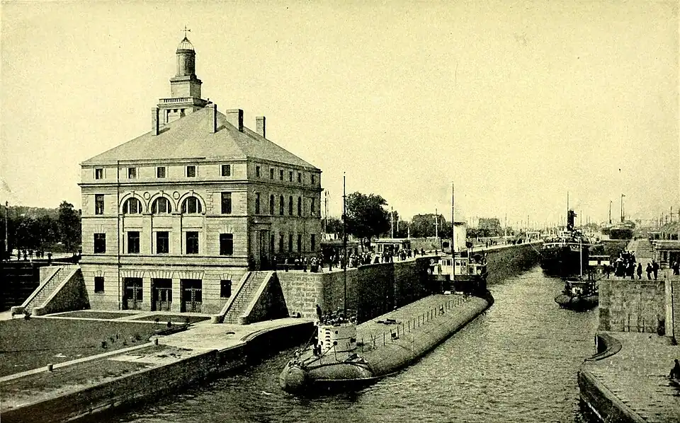 The Saint Mary's Canal, commonly known as the Sault Sainte Marie Canal, connecting the waters of Lake Superior with those of the Saint Mary's River and Lake Huron around the Saint Mary's Falls in Michigan, is but a few thousand feet long, and is chiefly remarkable for the enormous traffic and for having the largest lock in the world. This lock is of masonry, is 800 feet long, 100 feet wide, with a depth of water on the sill of 21 feet and a lift of 18 feet. The Saint Petersburg and Kronstadt Canal was completed in 1884. Owing to the bar at the mouth of the Neva, ships were not able to reach Saint Petersburg, and the canal from Kronstadt to the capital was built at a cost of $7,200,000 to overcome this barrier. It is 18.75 miles long and 22 feet deep, with a bottom width of 275 feet, except near Saint Petersburg, where it is only 207 feet. The North Sea and Baltic Canal, now known as the Kaiser Wilhelm Canal, runs from Holtenau on the Baltic to Brunsbüttel on the Elbe. It is 60 miles long, has a bottom width of 85 feet and a depth of water of 28 feet. By this canal sea-going vessels save over 200 miles in going from the Baltic to the North Sea. The Amsterdam Canal, like the Manchester, was built to connect an inland city with the sea. The total length of this canal is 16.5 miles from Amsterdam on the Zuyder Zee to the North Sea, but as the route lay through the inlet called the Y and the Wyker Meer, only 3 miles had to be excavated. This canal is 88 feet 7 inches wide on the bottom and 23 feet deep. Besides these completed ship canals, a number of others have been projected and some of them put under construction. The most notable of these are the Panama and the Nicaragua canals (qq.v.) across the Central American isthmus, and those described in the article Trans-Isthmian Canals. For descriptions of canals for other than transportation purposes, see Drainage; Irrigation; Water-Supply, etc.