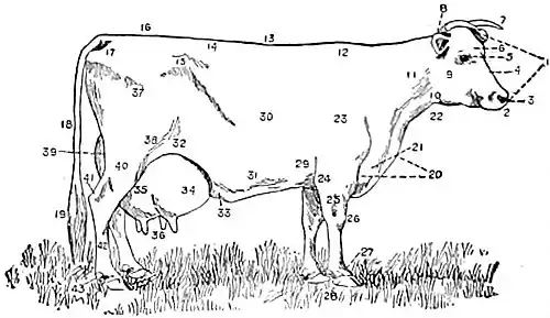 | 2. Muzzle. | 13. Back. | 24. Elbow. | 35. Hind udder. |