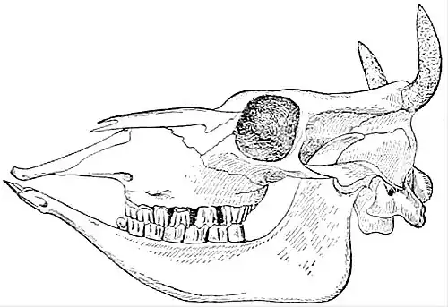 Dentition of a young Jersey cow, showing the small incisors and canines crowded in the extremity of the lower jaw (none in the upper jaw), and the great grinders (molars and premolars).