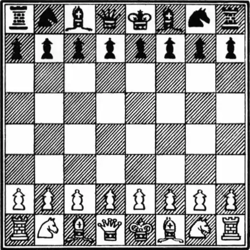 The chess-board is marked out into sixty-four square divisions, which are colored alternately black and white, in order the more clearly to determine and denote the respective movements of the several pieces. In placing the thirty-two pieces with which the game is played upon the board, each player must always have a white corner square at his right hand. There are two sets of pieces, of opposite colors, of sixteen men each, and of various powers according to their rank. These sets of men are arrayed opposite to each other and attack, defend, and capture like hostile armies. The accompanying diagram will best explain the name, form, and place of each man at the commencement of the game.