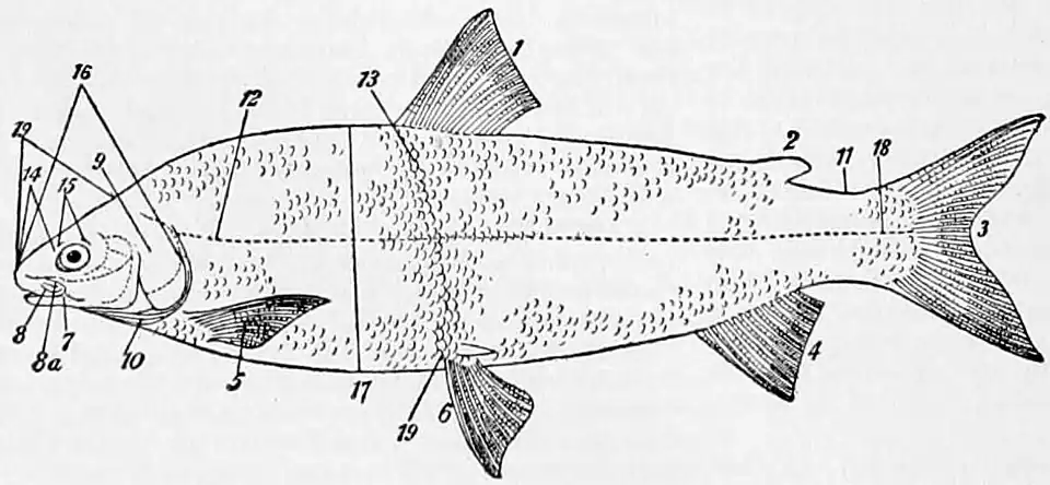 | 1, Dorsal fin; 2, adipose fin; 3, caudal fin (tail); 4, anal fin; 5, pectoral fin (paired); 6, ventral fin (paired); 7, mandible (lower jaw); 8, maxillary (upper jaw); 9, operculum (gill-cover); 10, branchiostegals; 11, caudal peduncle; 12, lateral line; 13, series of crosswise scales at the point usually counted; 14, snout (nose); 15, eye; 16, head; 17, depth; 18, base of caudal fin; 19, distance from snout to nape or occiput. |