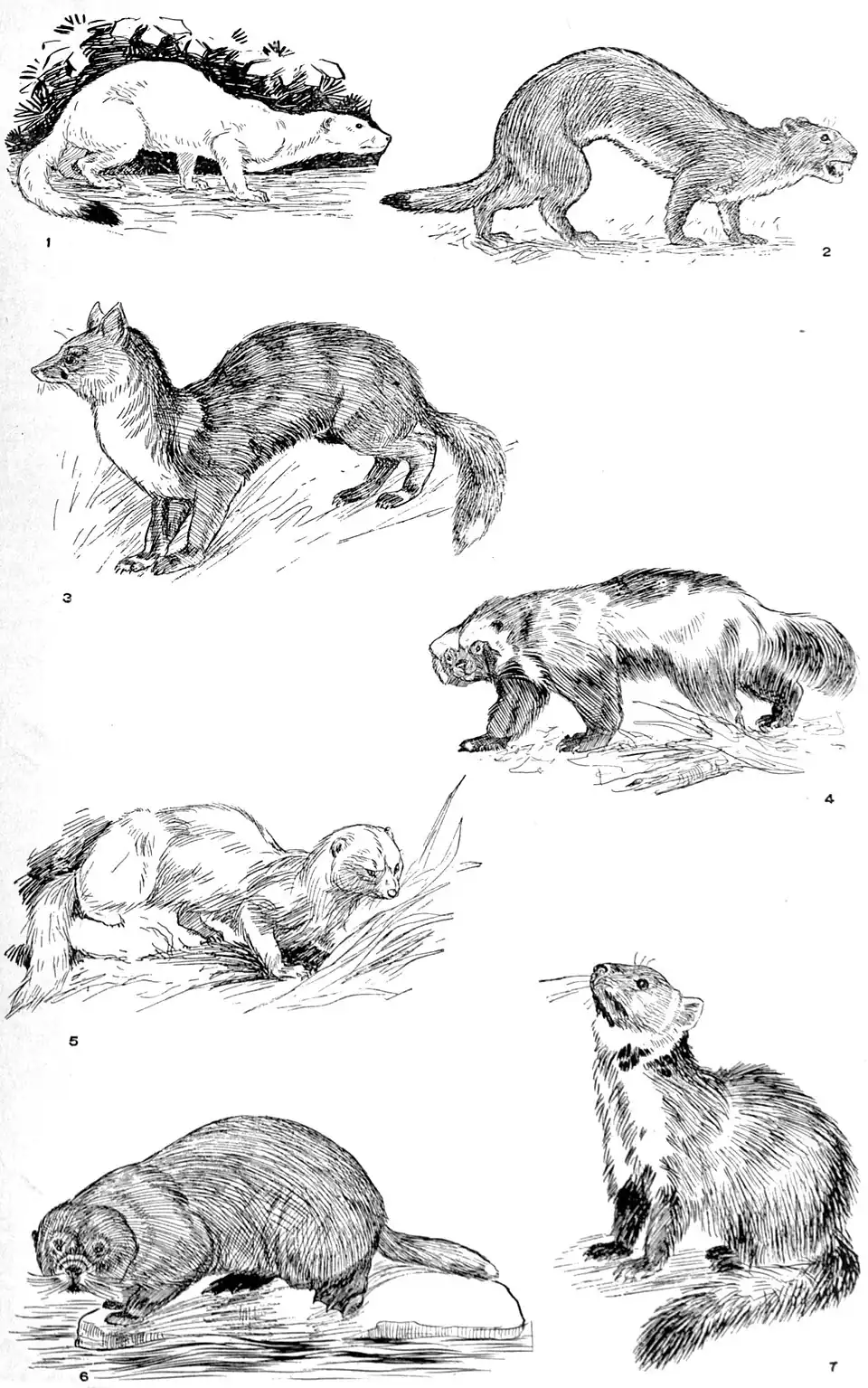 FUR-BEARING ANIMALS. The group of animals whose pelts are utilized as fur garments or ornaments, forming the carnivorous family Mustelidæ. This family, which includes, besides its typical weasels (Mustelinæ), the skunks (Mephitinæ), the badgers (Melinæ), the otters (Lutrinæ), and the sea-otters (Enhydrinæ), the honey-badgers, ratels, etc., is world-wide in its spread outside of Australia. It is in the Northern Hemisphere, however, that the family is now most numerous and well represented; and it is in response to the demand of the cold winters of the subarctic regions, to which the most valuable of these animals are confined, that their coats have become the warm felts which mankind finds so serviceable and attractive. All are small animals, the largest (the wolverene) being only about three feet long. Their bodies are in most cases slender, their legs rather short, their heads round, with very powerful jaws and teeth, and their tails (except in the skunks) are rather short. Great strength, nimbleness, and courage characterize them, and many exhibit a blood-thirst beyond that of any other carnivore; nevertheless, they have been tamed. Weasels have always acted as mousers in the East, and were so used in ancient Greco-Roman civilization. Ferrets still serve as vermin-catchers, and otters have been taught to fish, while badgers were formerly used in cruel sport. Most of them are terrestrial and live in burrows of their own digging, but some are arboreal. They feed upon small mammals, birds, birds' eggs, fish, crustaceans, and insects; and all possess, in a greater or less degree, anal glands, from which they can discharge at will (sometimes shooting it a long distance) an acrid fluid, which is intensely offensive to the nostrils and mucous membrane of other animals. The chase of the leading members of this family has long been and still is an important industry on the frontiers of Europe and North America, and thousands of pelts have been gathered annually without exterminating any of the race, though the habitats of many species have been much reduced. Statistics of the trade in furs in London show that during the last century the receipts of pelts there of Mustelidæ alone, from North America exclusively, amounted to about 3,250,000 sables, 1,500,000 otters, 100,000 wolverenes, 3,000,000 minks, 25,000 sea-otters, 500,000 skunks, and 500,000 badgers, besides an unknown number of ermines, fishers, etc. “The scientific interest with which the zoölogist, as simply such, may regard this family of animals, yields to those practical considerations of every-day life which render the history of the Mustelidæ so important.” Consult authorities mentioned under Mammalia, especially Coues, Fur-Bearing Animals (Washington, 1877). See Badger; Ermine; Ferret; Fisher; Marten; Otter; Polecat; Sable; Sea-Otter; Skunk; Weasel; Wolverene; and similar titles.