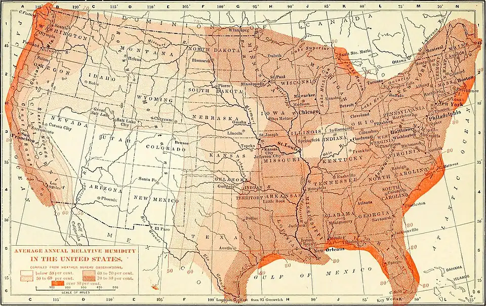 HUMIDITY (from Lat. humiditas, moisture, from humidus, umidus, moist, from humere, umere, to be moist; connected ultimately with Gk. ἱγρός, hygros, Icel. vökr, moist). Atmospheric. The moisture or aqueous vapor in the atmosphere. This vapor is really an invisible gas, and is the most important component of the atmosphere as to quantity next after nitrogen and oxygen. When this invisible vapor becomes visible it is called dew, fog, mist, haze, cloud, rain, hail, snow, frostwork, or frost, according to the size of the drops of water or the method in which the vapor condenses. Water and ice are not included under the term ‘atmospheric humidity,’ that term being strictly confined to the invisible vapor.
