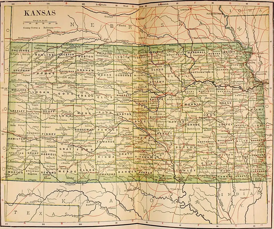 KANSAS. (Named after the Kansas Indians, called by themselves Kanze, a word said to refer to the wind; popularly known as the ‘Sunflower State’). One of the North Central States of the United States. It lies exactly in the centre of the country, between 94° 37′ and 102° west longitude; its north and south boundaries are formed, respectively, by the 40th and the 37th parallels. The State is bounded on the north by Nebraska, on the east by Missouri, on the south by Indian Territory and Oklahoma, and on the west by Colorado. It has the form of a parallelogram with straight sides, except at the northeastern corner, which is cut off by the Missouri River. Its dimensions are 408 miles from east to west, and 208 miles from north to south; its area is 82,080 square miles, giving it the tenth rank in size among the States of the Union.