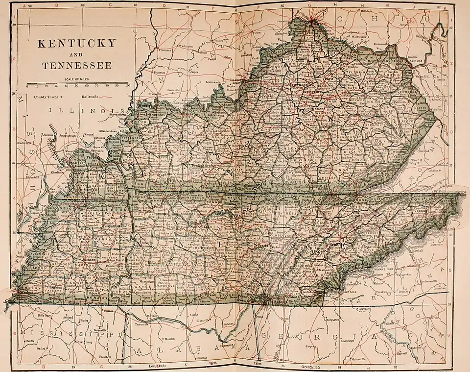 KENTUCKY. One of the South Central States of the American Union, lying between the Appalachian Mountain system and the Mississippi River. It is bounded on the north by Ohio, Indiana, and Illinois, the entire boundary being defined by the Ohio River; on the northeast by West Virginia; on the southeast by Virginia; on the south by Tennessee; and on the west and northwest by Missouri and Illinois, the Mississippi River flowing along the western boundary. It extends from latitude 36° 30′ to 39° 6′ N. and from longitude 82° to 89° 38′ W. Its greatest length from east to west is nearly 400 miles, its extreme breadth about 180 miles, and its area 40,400 square miles, of which 400 miles are water.