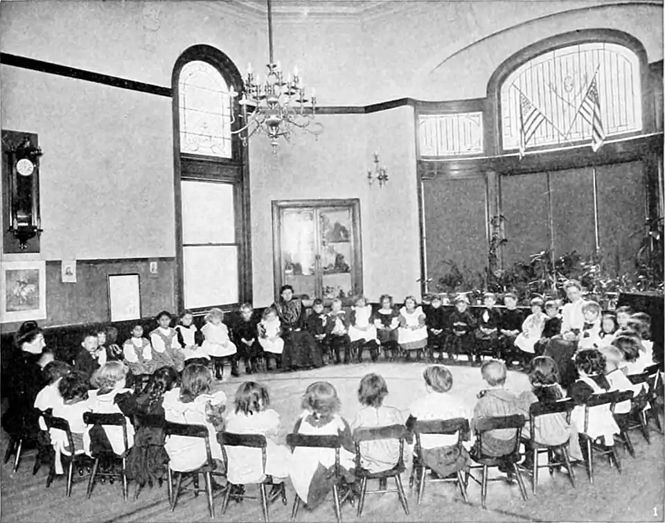 The pioneer movement for the establishment of kindergartens in the United States was led by Miss Elizabeth Pcabody, of Boston, who on becoming interested in Fröbel's writings went to Germany in 1867 to study his system. She returned the next year and devoted the remainder of her life to the popularizing of the Fröbelian principle of education, ably seconded by Mrs. Horace Mann and Dr. Henry Barnard. During the decade of the sixties several kindergartens were established in Boston, Mass., Hoboken, N. J., and Louisville, Ky. A similar movement was led independently in New York by Miss Henrietta Haines and Miss Boelte, the latter a pupil of Fröbel's widow. During the seventies philanthropic associations were established in numerous cities for the support of kindergartens as charitable institutions. These were begun in Florence, Mass., in 1874, and in Boston in 1878; this movement prospered especially in San Francisco, Brooklyn, New York, Chicago, Pittsburg, Cincinnati, and Louisville, and was supported in various other places. The first public kindergarten was opened in Boston in 1870, but shortly abandoned. The first permanently successful attempt to make the kindergarten a part of the public-school system was begun in Saint Louis in 1873, under the leadership of Miss Susan Blow and Dr. W. T. Harris. Boston, Philadelphia, Chicago, Milwaukee, and in time most of the large cities and many of the smaller ones, have followed Saint Louis in this respect, usually through the absorption of free kindergartens previously established by private benevolent associations. In 1898-99 there were reported to the United States Commissioner of Education 2884 kindergartens, having 5764 teachers and 143,720 pupils. These statistics are far below the actual numbers, for the reports made are purely voluntary. Statistics privately collected show the number of kindergartens to have increased as follows: in 1873, 43; in 1882, 348; in 1892, 1311; in 1898, 4363. The kindergarten movement was furthered by a magazine The Kindergarten Messenger, first published in 1873 by Miss Peabody. At the present time there are very many similar publications. The American Froebel Union, established in 1867, also by Miss Peabody, was the forerunner of many such associations. The Union became the kindergarten department of the National Educational Association in 1885. Many schools for the training of kindergartners have been established either as independent enterprises or in connection with other educational institutions, chiefly normal schools. The best known of these, now connected with normal schools, are the Chicago Kindergarten College, and those in connection with the Teachers College, Columbia University, and with Pratt Institute, Brooklyn.