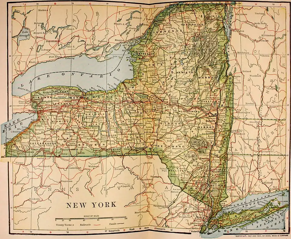 NEW YORK (popularly called the ‘Empire State’). A North Atlantic State of the United States. It lies between latitudes 40° 30′ and 45° 1′ north, longitudes 71° 51′ and 79° 46′ west, and is bounded on the northwest by Lake Ontario and the Saint Lawrence River, which separate it from the Canadian Province of Ontario; on the north by the Province of Quebec; and on the east by the States of Vermont, Massachusetts, and Connecticut, a part of the Vermont boundary being formed by Lake Champlain. On the south the Atlantic Ocean and its arms, Long Island Sound, New York Bay, and Staten Island Sound, surround Long Island and Staten Island, which belong to the State, while the mainland portion is bounded by a part of these waters and by the States of New Jersey and Pennsylvania. On the west the boundary is completed by the latter State, together with Lake Erie and the Niagara River. New York has roughly the shape of a triangle, with the base on the Great Lakes and the apex extending down to the ocean. Its extreme length from north to south is 312 miles, and from east to west 326 miles. It ranks twenty-sixth in size among the States, its area being 49,170 square miles, of which 47,620 square miles are land surface.