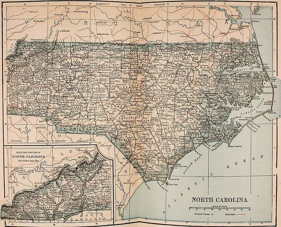 NORTH CAR′OLI′NA (popularly called the ‘Old North State,’ also the ‘Turpentine State’). A South Atlantic State of the United States. It lies between 33° 50′ and 36° 33′ north latitude, and between 75° 27′ and 84° 20′ west longitude. It is bounded on the north by Virginia, on the east and southeast by the Atlantic Ocean, on the south by South Carolina and Georgia, and on the west by Tennessee. Its extreme length from east to west is 503¼ miles, and its extreme breadth 187½ miles, the average breadth being about 100 miles. Its area is 52,250 square miles, including the large coast lagoons, the land surface covering 48,580 square miles, or 31,091,200 acres. Its gross area is, according to the latest official figures, exactly equal to that of Alabama, and is exceeded by 23 of the other States. In land area North Carolina ranks 25th.