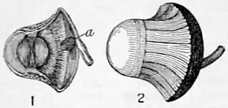 | 1. Section of the eye, showing the interior parts of the pecten at the insertion of the optic nerve (a) by which the vision is regulated under the great possible expansion and contraction of the eye. 2. Sclerotic coat, showing the stave-like pieces, connected by elastic tissue permitting great expansion and contraction. |