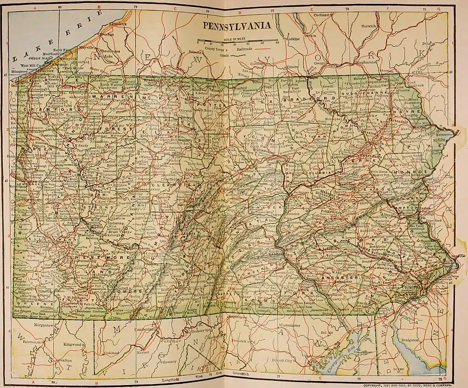 PENNSYLVA′NIA (from Penn + Neo-Lat. sylvania, woodland, from Lat. silvanus, sylvanus, relating to a forest, from silva, sylva, wood, forest; named in honor of William Penn). A North Atlantic State of the United States, situated at the apex of the arch formed by the coast States from North Carolina to New England, whence it is popularly called the ‘Keystone State.’ It lies between 39° 43′ and 42° 15′ north latitude, and between 74° 43′ and 80° 31′ west longitude. It is bounded on the north by New York State, and for about 50 miles in the west by Lake Erie, on the east by New York and New Jersey, on the south by a small part of Delaware and by Maryland and West Virginia, and on the west by West Virginia and Ohio. In shape it forms a rectangle. The north and south boundaries are straight lines running along parallels 157¾ miles apart, except for the small projection of the northwestern corner. The western boundary is a straight line running along the meridian, but the eastern boundary is formed by the Delaware River, which forms two large and regular zigzag bends, making the extreme length of the State 302 miles. The area is 45,215 square miles, of which 44,985 square miles, or 28,790,400 acres, are land surface. The State ranks twenty-ninth in size among the United States.