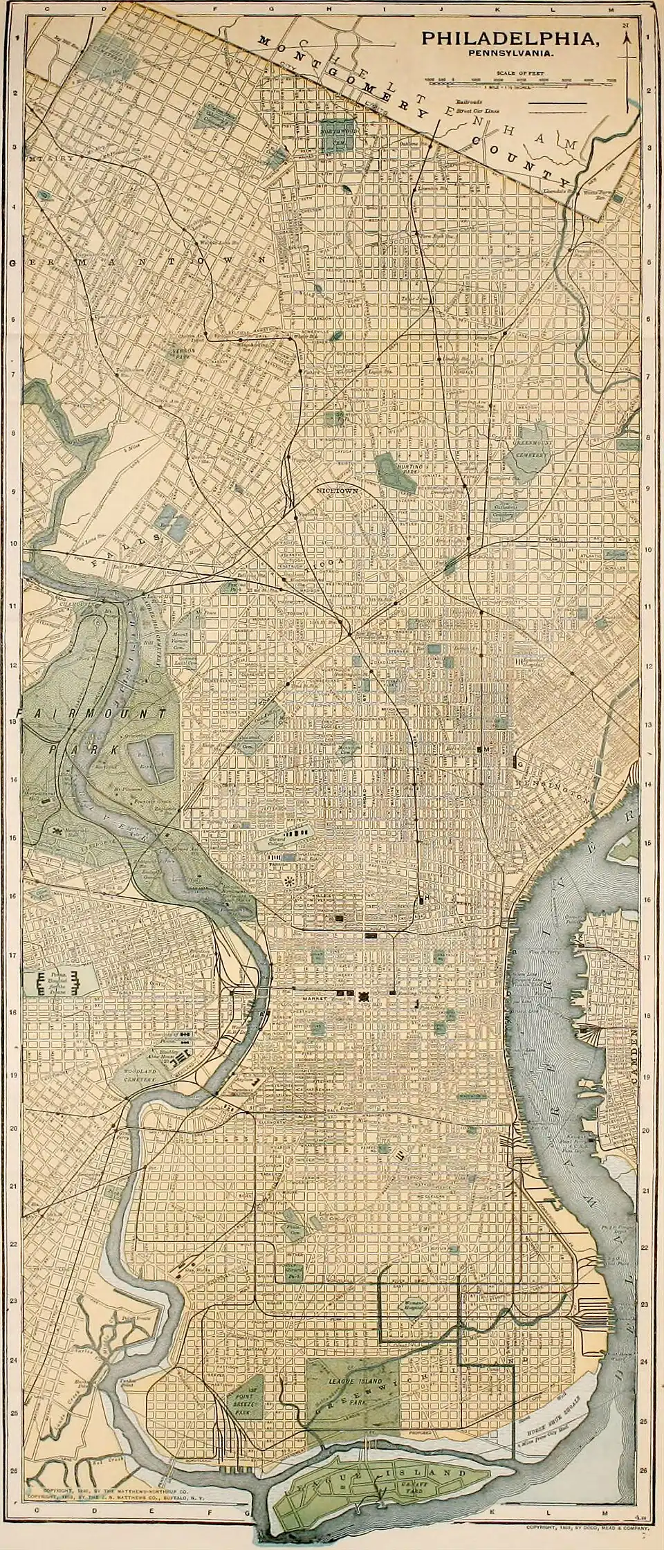 Description. William Penn founded the city on the narrow neck of land, some two miles wide, lying between the Delaware and Schuylkill rivers. Disregarding his plan for a simultaneous growth of the city backward from each river, the early settlers preferred to remain near the Delaware, along which occurred the first north and south expansion of the city. It was not until the beginning of the nineteenth century that the westward growth of the city reached Broad Street, the half-way line to the Schuylkill. From this time on the city has grown more rapidly, extending southward to the junction of the two rivers, westward far beyond the Schuylkill to Cobb's Creek, and northward in two main branches, the easternmost following the Delaware to Poquessing Creek, eighteen miles from the southern limit, and the westerly through the suburban region stretching ten miles along the Wissahickon—a tributary of the Schuylkill. In the western and northern sections of the city large areas of open country still exist. From the dike-protected lowlands of the south, five feet below the average high tide, the city rises gradually to heights of 443 feet in the hilly regions of the northwest. The general plan of the streets is determined by the east and west direction of Market Street, the main business thoroughfare, 100 feet wide, which runs directly west from the Delaware, a distance of six miles, separating the city in respect of street numbering into north and south divisions; and by Broad Street, 113 feet wide and 12 miles long, which at City Hall Square intersects Market at right angles. The main portion of the city is laid out with great regularity, the numbered streets running parallel with Broad, and the named streets with Market. The regularity of the general plan is broken, however, in the portion east of the Schuylkill, by Ridge and Germantown avenues, which intersect diagonally the streets north of Market, and by Passyunk and Moyamensing avenues, south of Market Street; in West Philadelphia, Lancaster Avenue, north, and Woodland Avenue, south of Market Street, act in a similar manner, though in this and in other outlying sections there is, in general, less attempt to follow strictly the regularity of the older portions of the city. There are more than 1560 miles of streets, of which some 900 miles are paved with brick, stone, or asphalt, 225 macadamized, and the remainder unpaved. The mileage of sewers is 951 and of water mains 1319. The street railways (employing the overhead trolley system, and in 1902 carrying 325,801,963 passengers) have a total mileage of 475, and the steam railroads of 360. At the present time (1903) there is under construction a subway system of four tracks from the Delaware to the Schuylkill, with an elevated extension along Market Street from the Schuylkill to the city line. Twelve public and twelve railroad bridges cross the Schuylkill, and one railroad bridge the Delaware; and among these are some of the finest structures of the kind in the country.