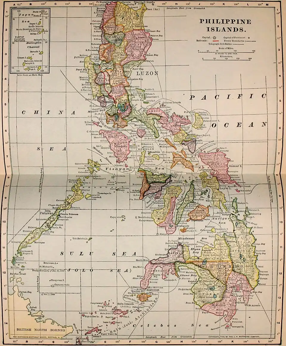 PHILIPPINE ISLANDS. An archipelago forming the most northern group of islands in the Malayan or Eastern Archipelago. It lies wholly within the tropics. The land surface extends between latitudes 21° 10′ and 4° 40′ N., 1150 statute miles; the east and west limits are longitude 116° 40′ and 126° 34′ E., making about 650 miles. The most northern land in the Philippines is Y'Ami Island, of the Batanes group; the most southern is Balut Island, of the Sarangani Islands, south of Mindanao; the most western is Balabac Island, north of Borneo; and the most eastern is Sancó Point, on the east coast of Mindanao. The archipelago is bounded on the north and west by the China Sea, on the east by the Pacific Ocean, and on the south by the Sea of Celebes and the coastal waters of Borneo. It is 93 miles distant from foreign territory on the north (Formosa); 31 miles from Balambangan, an island near Borneo, on the south; 510 miles from the Pelew group (German) on the east, and 515 miles from Cochin-China (French) on the west.