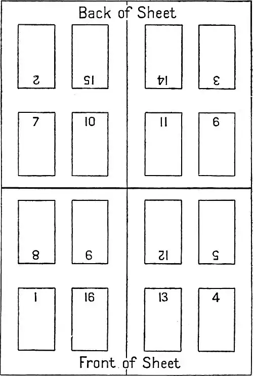 The printer's form may consist of any number of pages from 2 to 128. ‘Imposition’ is a method of arranging pages so that they will follow one another upon the printed paper in the proper consecutive order. The method of imposition or the order of arrangement differs according to the number of pages in the form, but the general principle of the process may be understood from the following diagram of a 16-page form, in which the numeral in each case indicates the number of the page in that form and its location the top of the page. To guide the binder in arranging the printed sheets in their proper order, letters or numerals known as signatures are placed at the foot of the first page of each section. The letters J, V, and W are not used for this purpose.