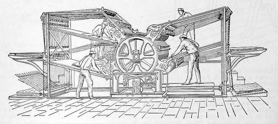 Printing Presses. The earliest engraving of a printing press shows a stout framework of wood posts, firmly braced against the ceiling to resist upward pressure, a bed plate of stone as a rest for the form of type, which could be exposed to receive ink, and then be slid upon ways under the platen or pressing surface. Impression was given by a large screw of wood over this platen and this screw was moved by a long bar of wood and iron. The sheet of paper to be printed (about 16×20 inches was a common size) was laid upon an inclined framework of wood covered with blanket or parchment, which was hinged to slide on the ways and to be placed under the platen. This platen impressed only one-half of one side of the paper; to print the sheet 16×20 on both sides the pressman had to give four pulls on the bar. To print with uniform margin and in accurate register, the sheet on its first impression was pierced with small perforations on the front side, and afterwards suspended from holes so made on properly placed points when the second side was printed. Although the mechanism of the press was rude and even petty, good printing was done upon it by a competent pressman. The first improvement in construction was made by Blaew, of Amsterdam, in 1601, who in addition to other devices attached springs to the platen moved by the screw, so that it could have a quick return movement without special exertion from the pressman. In 1786 M. Pierres, of Paris, invented a printing press entirely of iron, and strong enough to print one side of the sheet by one pull of the bar, but it did not meet with favor. About 1804, Earl Stanhope, of London, made great improvements on the large iron press of Pierres, adding many clever devices of his own for the lightening of labor. In 1806 Koenig, of Saxony, went to London with the model of an improved platen press, which he failed to introduce. His associates were more successful in reviving a patent issued to William Nicholson, of London, in 1790 for printing on a flat surface with cylindrical pressure. The new method was fairly tested upon a book form in 1811 and the new machine began to do the regular edition of the London Times in 1814. Soon after this all 30 daily newspapers had cylinder presses, for their greater speed and economy were advantages not to be neglected, but book work of all kinds continued to be done on platen presses of new construction. The Columbian Press, invented by George Clymer, of Philadelphia (1816); the Adams Power Press, made in 1830, by Isaac Adams, of Boston; the Washington Press, of Rust, of New York, in 1827, were for many years the favorites.