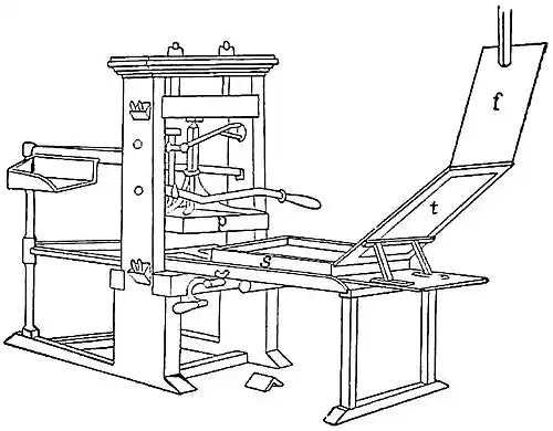 p, platen; s, sole or bed; t, tympan; f, frisket.